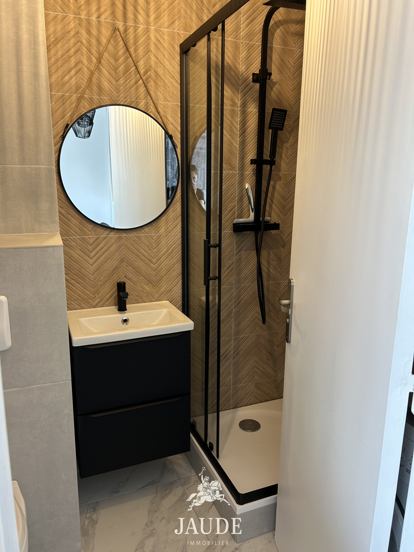 - Salle d’eau moderne avec WC suspendu.